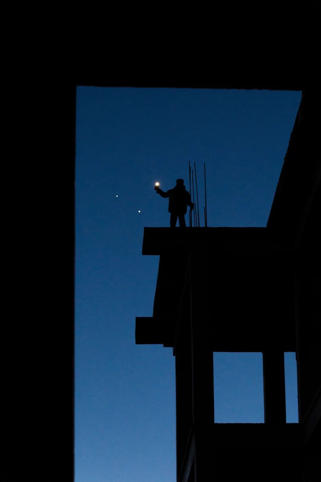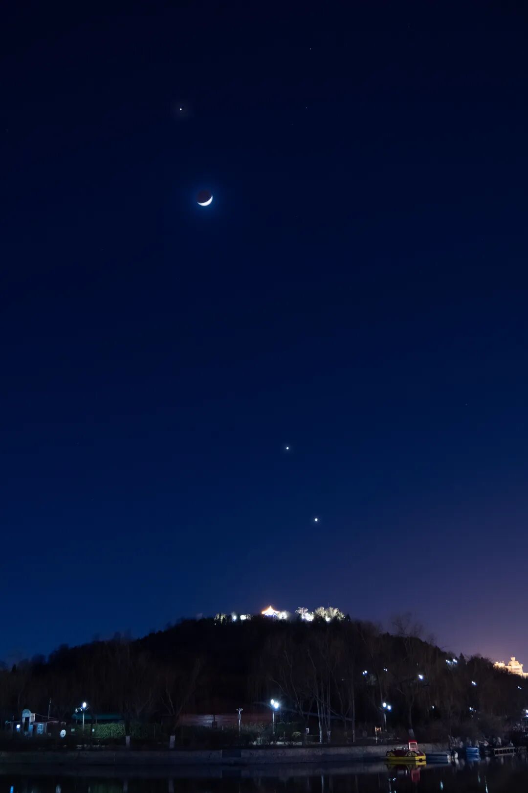 三月的天空是金星的舞台,她在傍晚时分,与木星汇合,你侬我侬,如胶似漆。我的小伙伴试图挂一颗“星星”到夜空中,这戏剧的一幕犹如走入超现实的世界,美的不可方物,动人心弦。