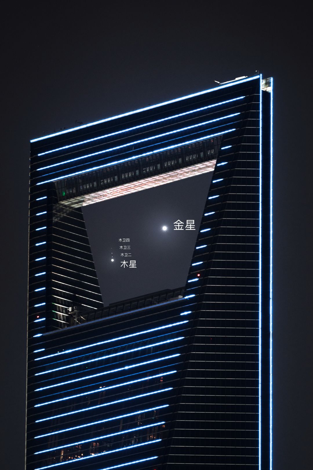 2023年3月2日,上海晴空万里,临近傍晚空气质量不断好转,于是我决定在市区内拍摄本次金星合木星。通过巧摄计划,我选择了3处能够实现拍摄双星穿过上海环球金融中心方孔特写的机位,这张照片是第一处,效果也是最好的。除了金木双星外,木卫二、木卫三、木卫四也清晰可见,就像一串小珍珠,我在照片中进行了标注。