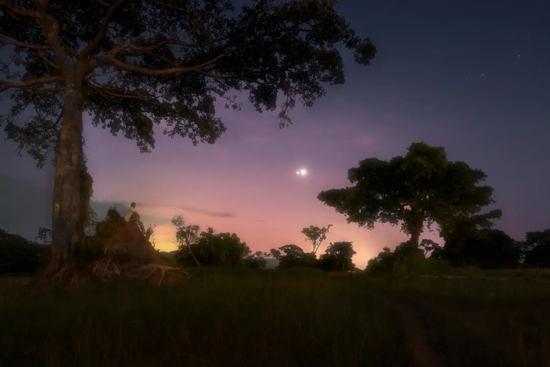 我坐在老树下的红土坡上,久久地望向你,却不过为了期待那一瞬。你沉静而又耀眼的光亮,若能散落成点点白花,开满这无垠的山坡,我便可以享受你馨香的簇拥,可是你,仍然是那样的遥远,我许是你注目下的一粒凡尘,瞻仰着你的威仪,我们仿佛永远分离,可又永远共享夜风、辽阔与生命。
