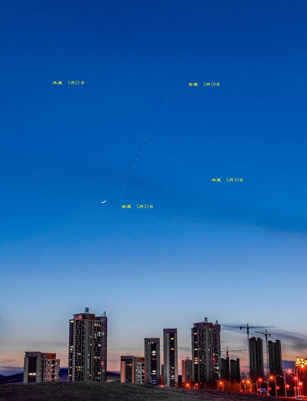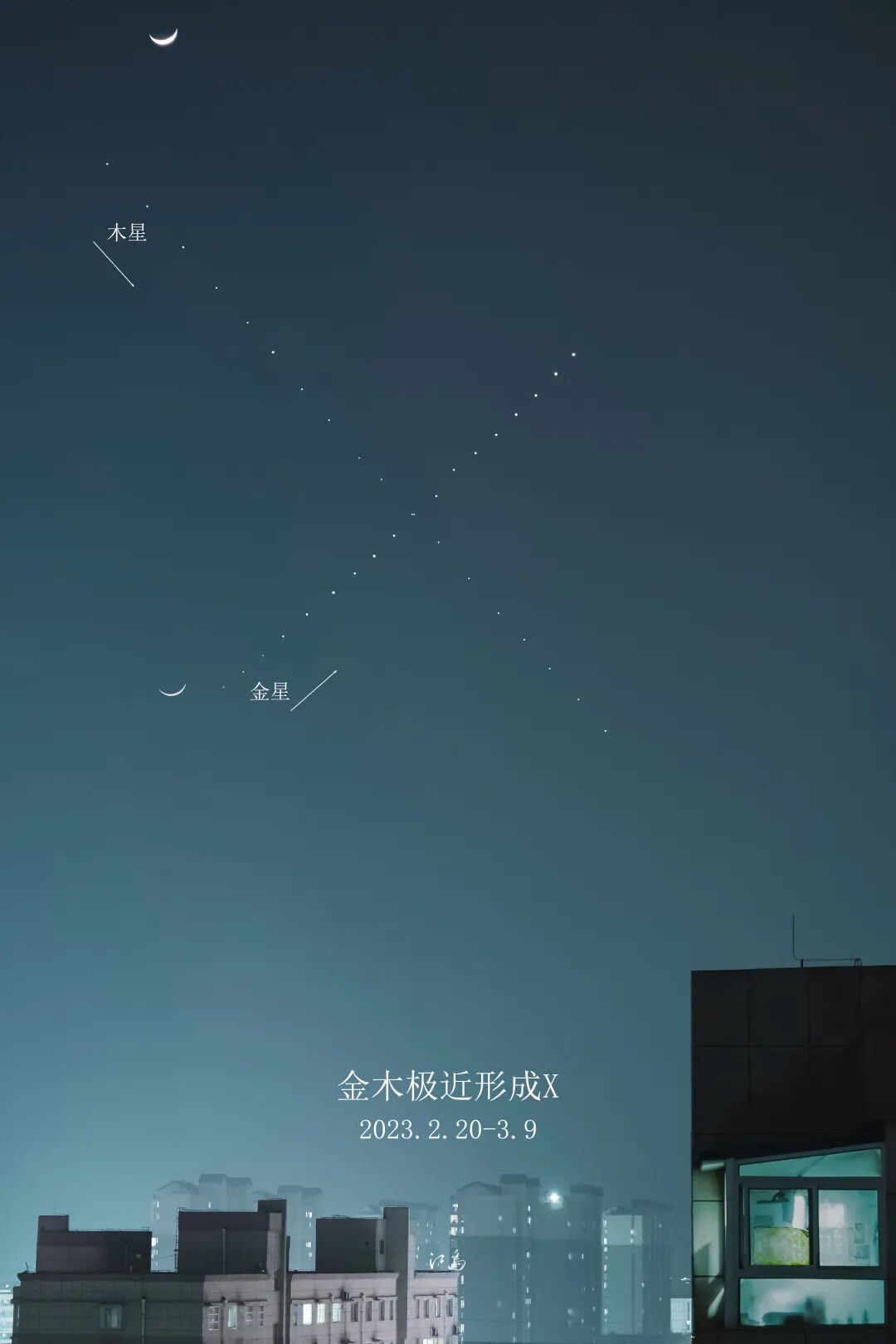 二月下旬至三月中旬,在日落后的西方天空余晖中,金星和木星熠熠生辉。如果从2023年2月20日至3月10日,你每天坚持观察并拍照,然后将两颗行星的运行轨迹连起来,将会发现它们的轨迹在空中交叉。于是,我提前做好拍摄计划,踩点选机位,从2月21日开始,每天晚上18:20拍摄一张,到3月10日,共持续拍摄18天。值得欣慰的是,这18天里,除了有一天云层遮挡,有几天的轻微雾霾天气外(雾霾天也能看见很亮的两颗行星),其余均是晴天,天气真的是帮了很大的忙。经过固定时间、固定地点、固定机位、固定参数的坚持,最终完成了拍摄计划。让我们跟随行星华丽的舞步,一起在天空中画个“X”。