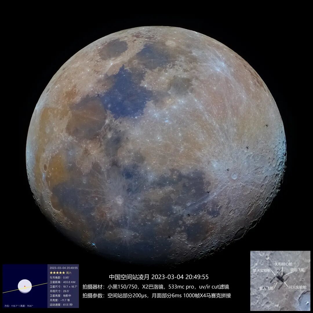 在拍了多次空间站凌月后,挑战中国空间站凌第谷环形山(Tycho)。第谷环形山(Tycho)是位于月球南半球高地的一个很突出的撞击坑,也是人们观测得最多的环形山之一。拍摄当天与好友来到机位,按动快门,成功完成拍摄。CSS轨道高约400KM,视宁度良好好,CSS各仓段清晰可见。使用赤道仪跟踪,分区曝光堆栈,合成HDR效果。