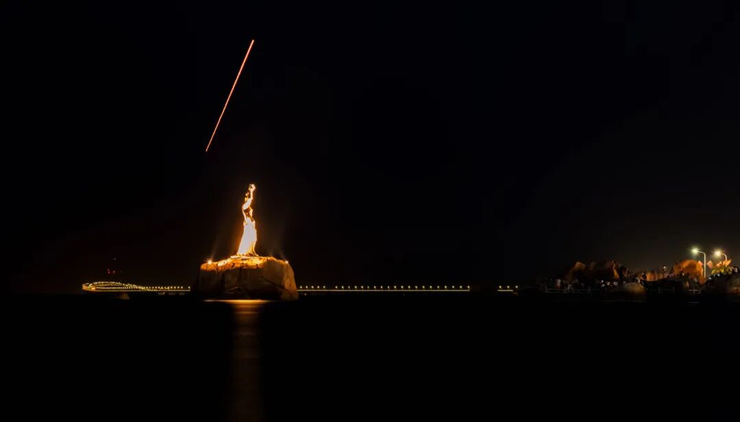 火星,八大行星中第二小的行星,离太阳第四近的行星,直径仅为地球的一半,在2020年10月14日到达了冲日的位置。-2.6等的亮度让火星短暂超过木星,成为夜空中最亮的星(次于金星)。图为珠海地标渔女上空的火星轨迹,像是一根火红的定海神针。