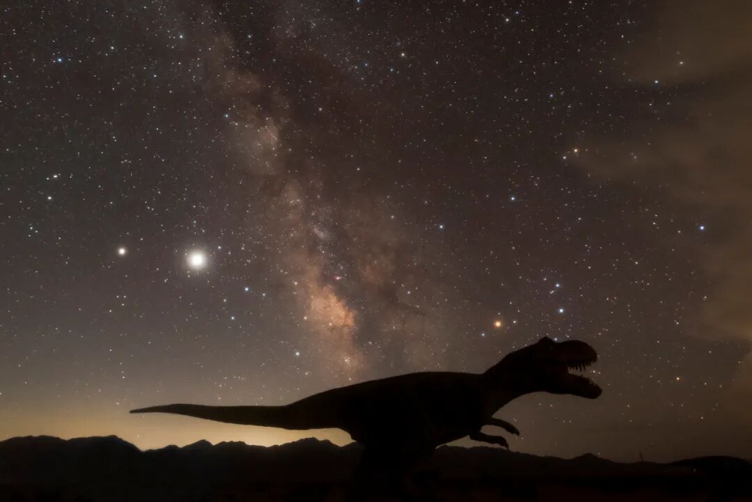 在前往内蒙古恐龙化石保护区的路上,路边的恐龙模型吸引着路过的游人,等到了夜幕降临,繁星显现出来,那一刻仿佛置身于侏罗纪时期。