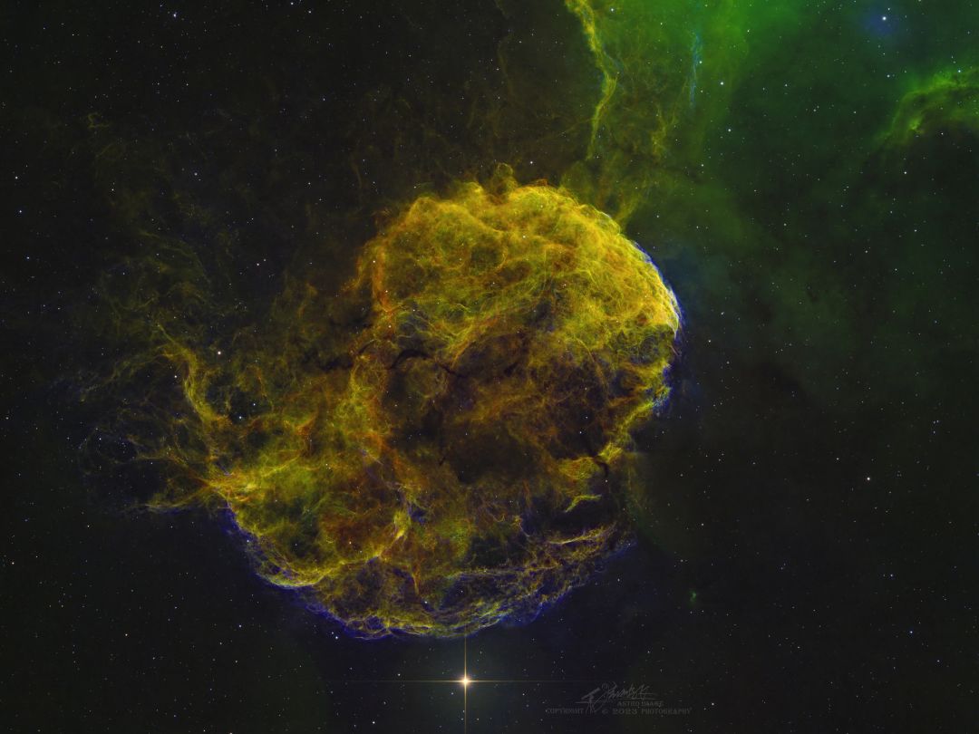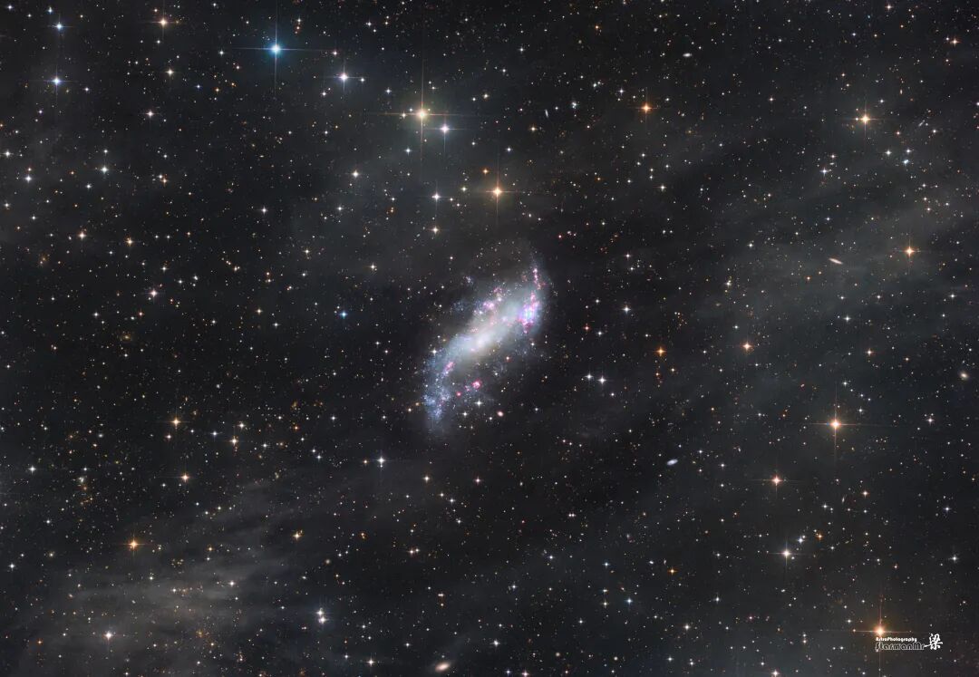 IC2574柯丁顿星云由美国天文学家爱德温·克丁顿(Coddington)于1898年发现。距离我们1200万光年,宽约5万光年。这个螺旋矮星系中恒星形成非常活跃。即便是透过银河系的尘埃云,色彩也仍然呈蓝色。透过窄带Ha和Oiii通道,可以看到大片的活跃区域。