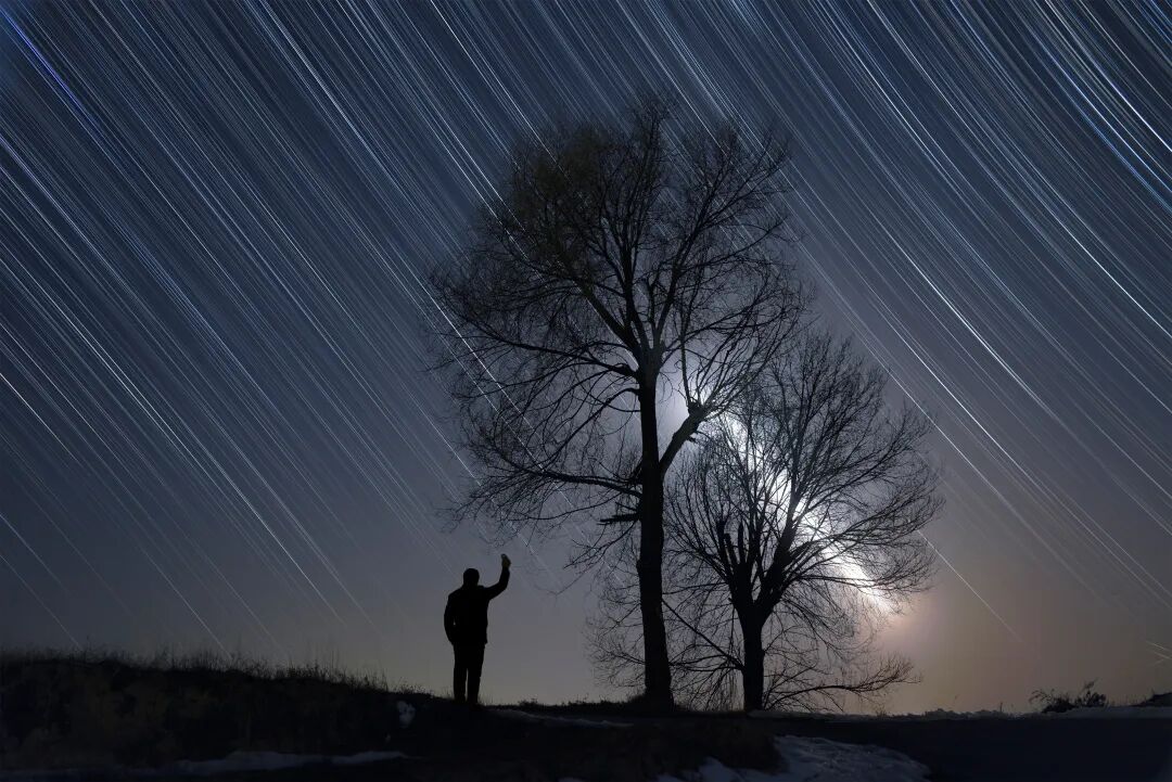 这个画面其实是来自于一段延时摄影的素材,但也是一个计划已久的画面,利用梯田的倒影,把天空中运动的星星以星轨的形式记录下来。