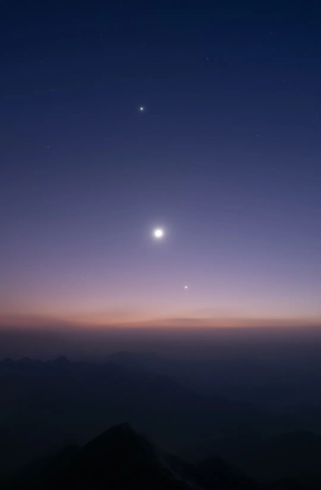 在太阳的余晖消失之前,木星、月亮和金星在群山之上连成一条线。此时的我见证着暮光的消失和渐渐显现的星辰,又一个静谧的夜晚即将到来。