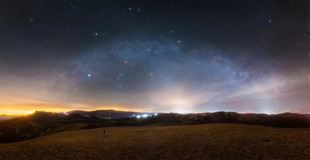 入夜之后,远处城市的灯光点亮了薄云,将其染上金黄的色彩;头顶闪耀的的冬季银河逐渐西沉,没入云中。寂寥的草原上,孤独的观星者有幸见证了这星河与流云交相辉映的片刻。