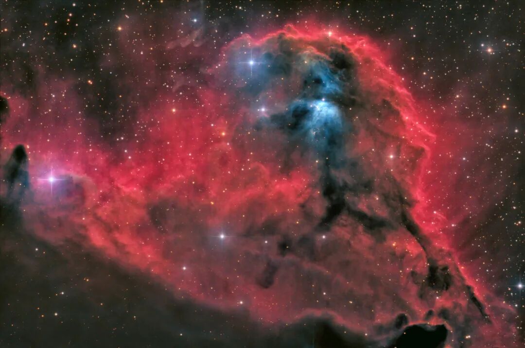 Cederblad 51是位于猎户座头部的Sharpless 2-264的一部分,人们也称其为Lambda Orionis环。它是一个分子云和H-II区域,位于猎户座分子云复合体的北部区域,这里正在形成大型热新星。分子云是由气体和尘埃组成的冷凝物质,其中包含大量的氢气,而H-II区域是由新生恒星辐射电离周围气体形成的区域。在这个区域中,新生恒星正在逐渐形成并释放出巨大的能量,这使得该区域成为了天文学家们关注的热门研究领域。通过对这一区域的观测和研究,我们可以更深入地了解星系的演化和宇宙的形成。