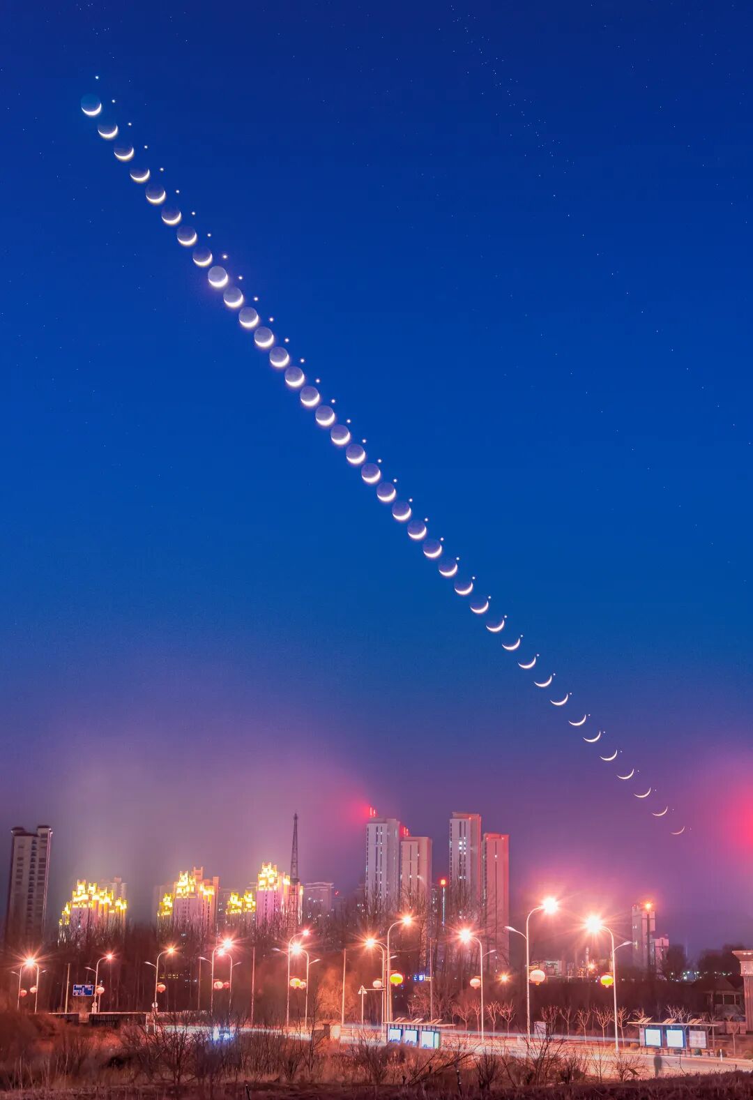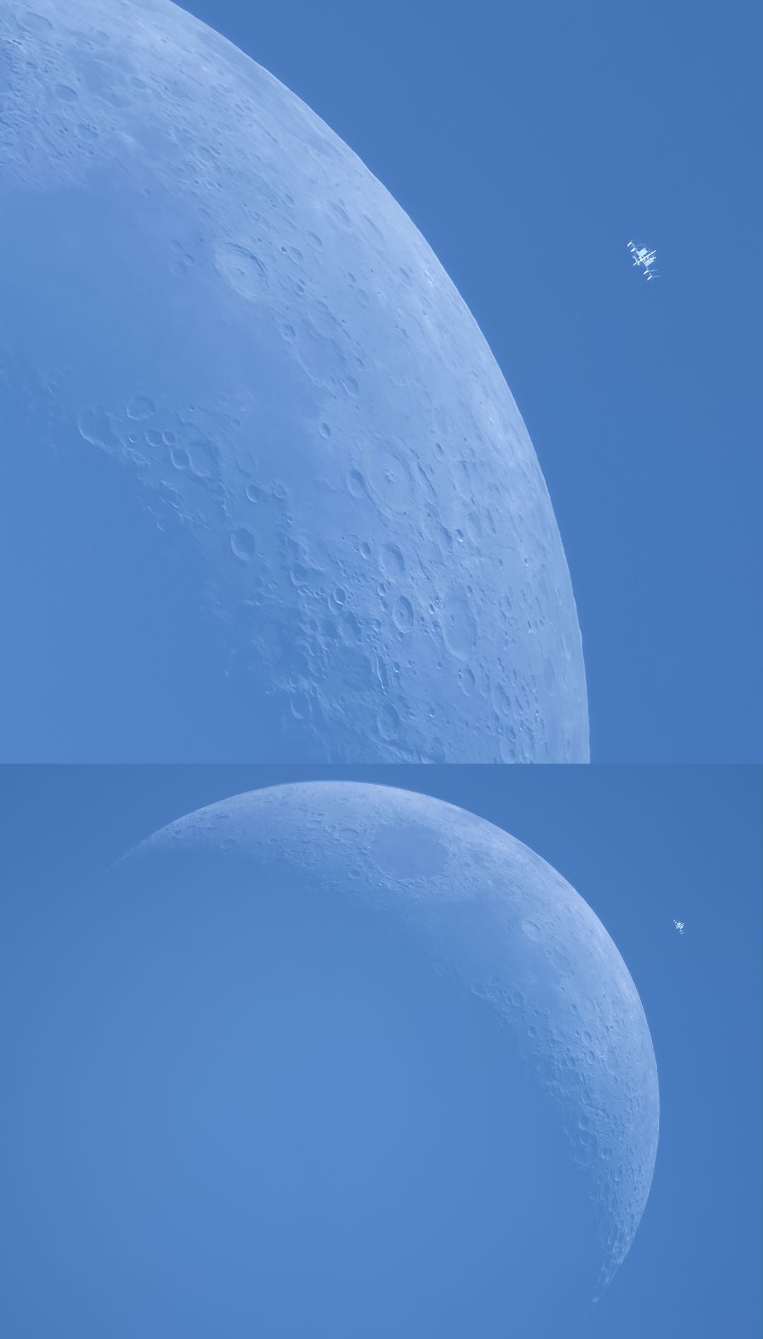 这张照片拍摄于下午14:43分,日月同辉。这种天象需要天空晴朗,能见度好,且日月同时处于地平线上时才可以看到,拍摄ISS站凌月更是个挑战。当天一如预测出现日月同辉,与好友相约来到凌月点,此刻ISS从距离我们头顶约435千米飞过,记录下凌月瞬间。ISS电池板及各仓段清晰可见。使用赤道仪跟踪连拍堆栈。