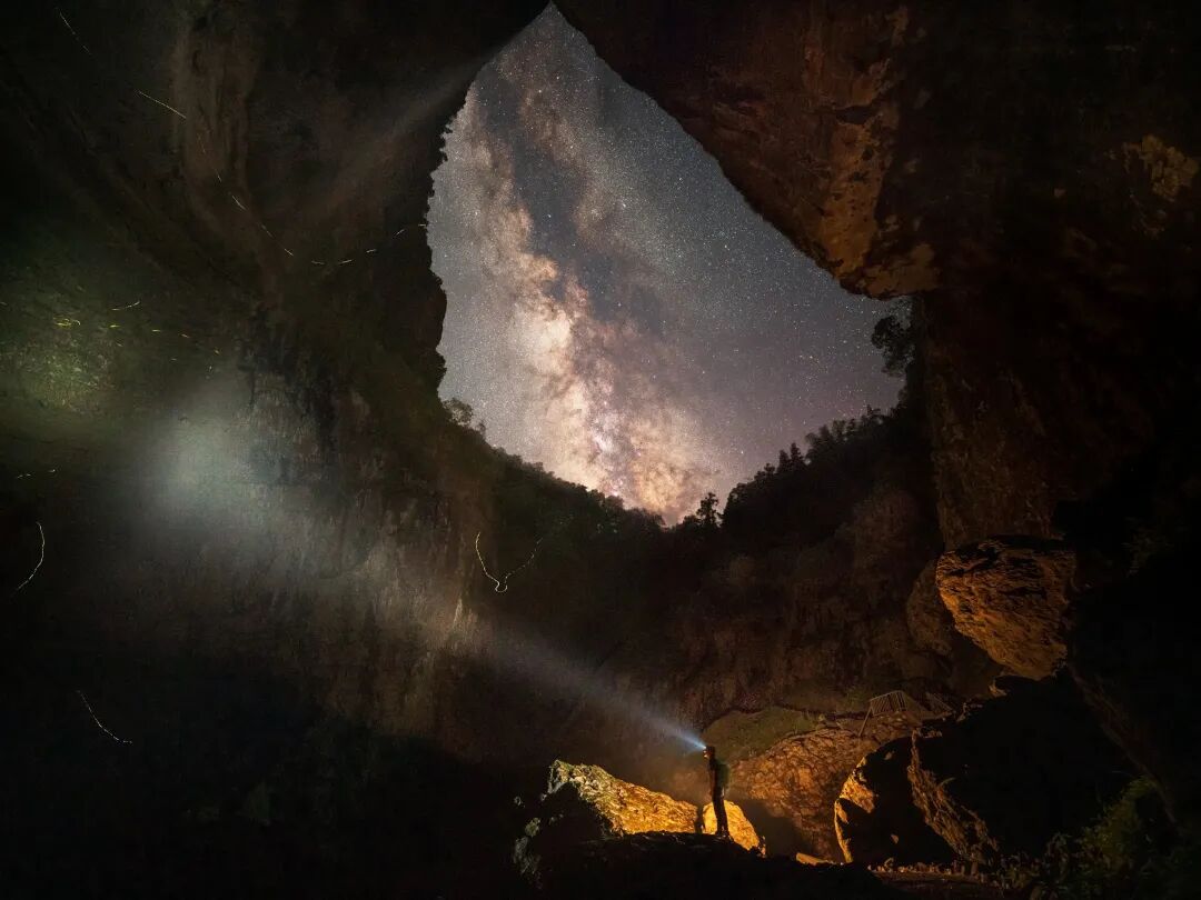 利用计划类软件提前计算银心掠过洞口的时间,在深夜到达天坑底部,完成星空拍摄。