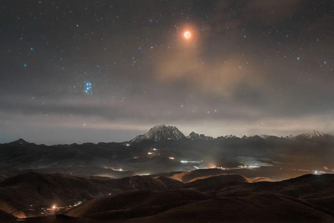 雅拉雪山拍摄的2022年11月月全食,拍摄时天空中有薄云,红月在云中若隐若现;雪山下则是附近村庄和道路的灯光。