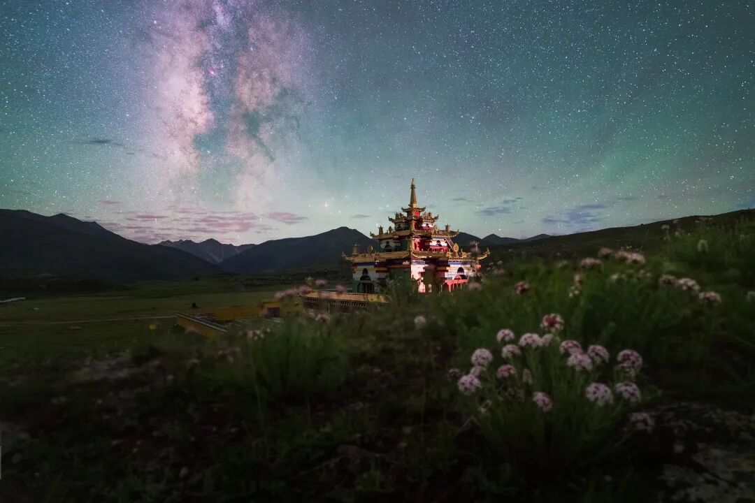在川西光污染小的地方,可以轻易拍摄到气辉的纹理。此时气辉与银河的颜色,巧妙的与草地上狼毒花的红绿色形成某种呼应。