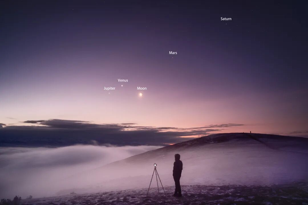 在星空营地经历了一夜的极端天气,天快亮时云海还未散去,天亮前拍下月亮与四大行星升起的一刻。