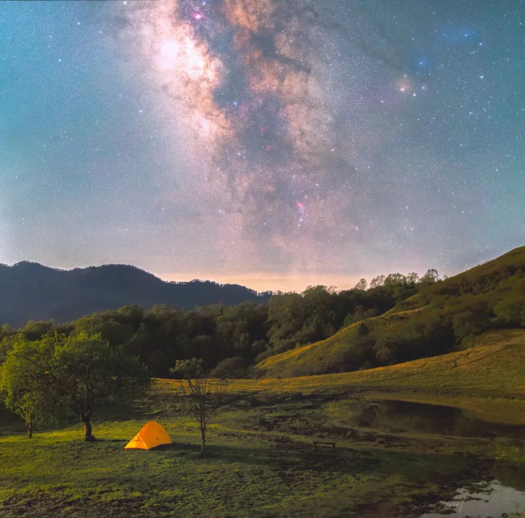 凌晨3点,月亮落入地平线。背着相机和赤道仪走到远处的山坡上,对准银河,按下快门。被繁星笼罩,是震撼,是释然,是感叹我们如此渺小。