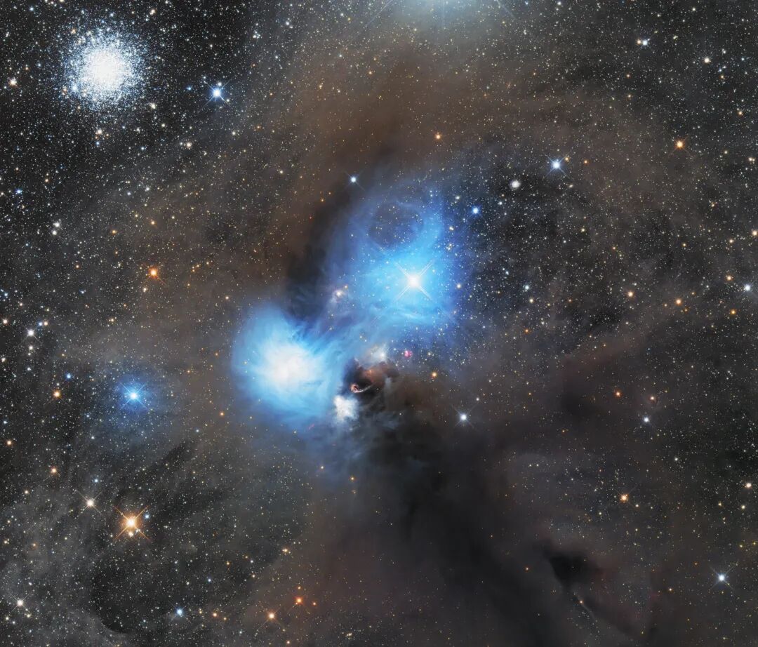 视野中呈现的泛蓝尘埃云和活跃年轻恒星位于南冕座北缘,距离我们不到500光年。这些尘埃云几乎完全遮掉了后方银河系背景恒星的星光。不过,在编录号为NGC 6726、6727、和IC 4812的反射星云复合体里,尘埃反射此区域年轻炽热恒星的星光,造就其鲜明泛蓝的特征色泽。此外,这些尘埃也遮住还处在诞生阶段的恒星。这片星云左方的泛黄小星云NGC 6729,折绕在年轻的南冕座R变星周围,它下方的弧状和圈状光弧,则是内部新恒星外泛物质所造成的赫比格-哈罗天体。这片星野在天空中的跨幅约1度,依这个邻近恒星形成区的距离来估算,其宽度将近有9光年。