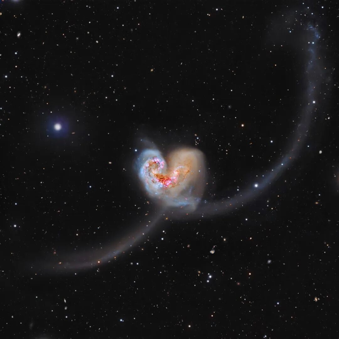 NGC4038&NGC4039 触须星系,距离地球4500万光年,两个星系相遇并融合为一个新的星系,在这个过程中,他们正形成一个爱心的形状。这是宇宙中最浪漫的相遇。