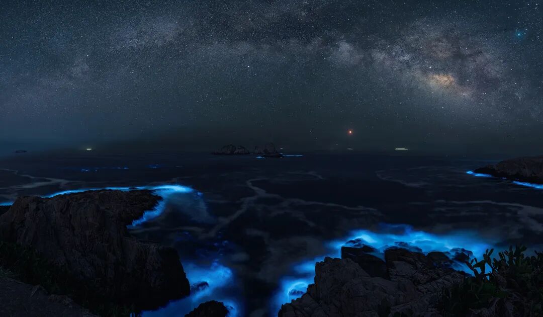 此地早年前计划过,一直忌惮不远处的灯塔会对拍摄有干扰,偶然机会看到别人的成片光污染问题不大,遂计划前往。本只打算在五虎礁这拍银拱,码头上碰到摄友,谈起前一晚蓝眼泪的事,有点小激动,一早晚饭吃完,就催促小伙伴去蹲点,因为可以拍到全景的机位只有三四个,其他均有遮挡。让人惊喜的是那天傍晚起蓝眼泪大爆发,海天呼应,确实让人终生难忘。