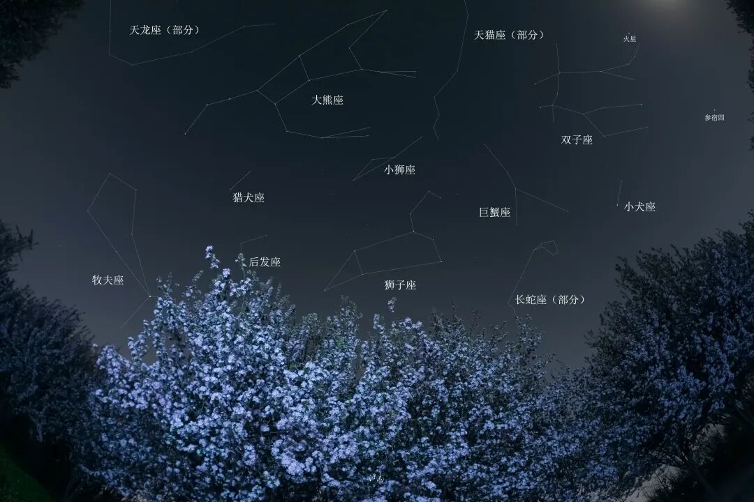 遥望春季星空,由星点组成的画卷铺展在夜空中,与地面的海棠花上下相对,熠熠生辉。