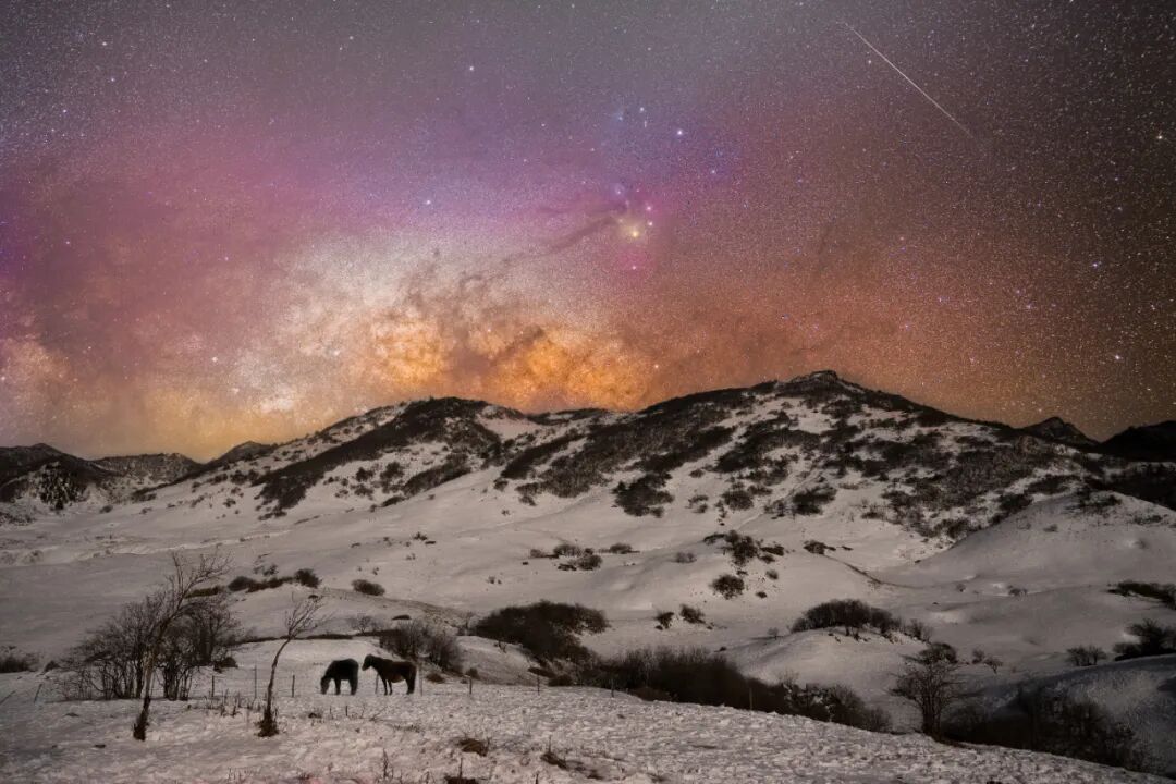 早春的红池坝高山积雪,野马在星空下停留。夏季银心从东方横越出地平线,宣告夏季银拱就快到来。