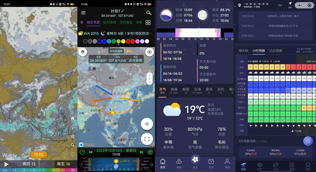 一些用来帮助我拍摄星空更加得力的APP(从左到右依次是Windy、巧摄、莉景天气、天文通)。