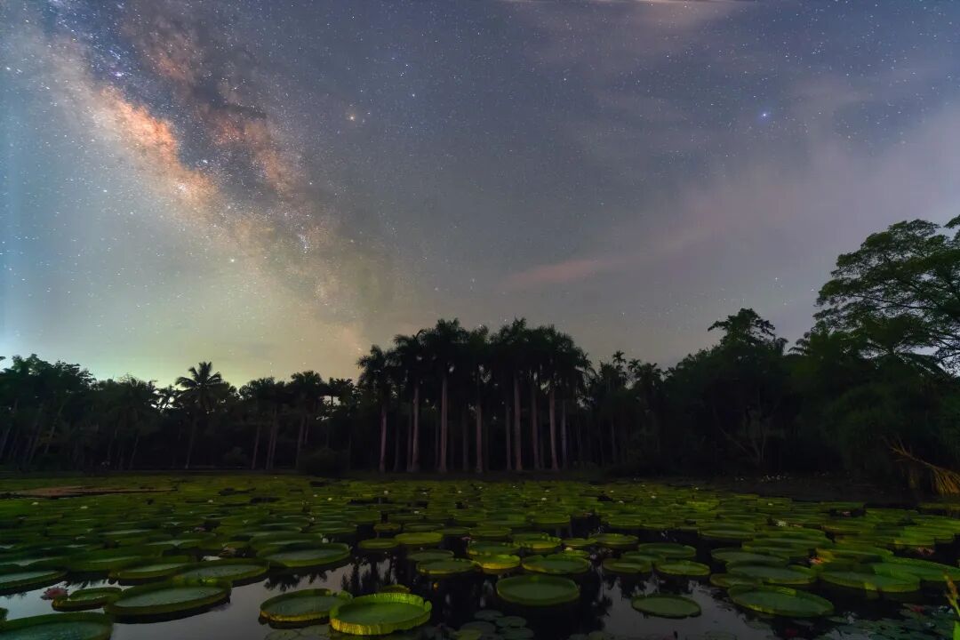五月前往西双版纳植物园拍摄萤火虫。雨季的天气变化极快,意外抓住了银河的身影,得到这张画面。下方的水池中是著名的水上观赏植物——王莲。其叶脉似伞架,具有很大的浮力,最多可承受六七十千克重的物体而不下沉。