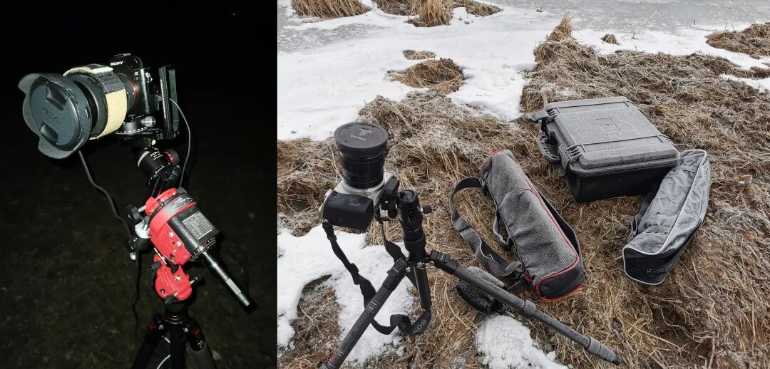 左图为赤道仪和天文改机;右图的设备在零下10度的湖边奋战过一夜之后,结上了一层厚厚的霜。