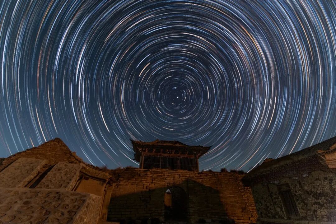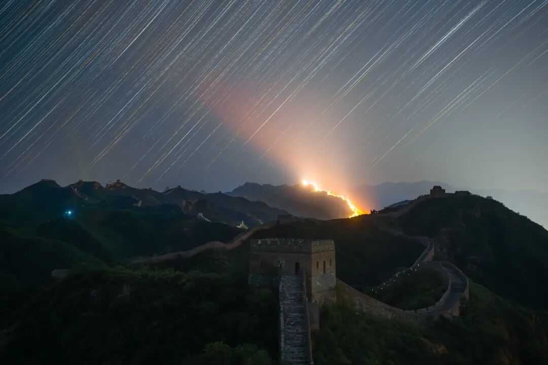 星轨如同银河的织物,缠绕在长城的身躯上,留下一道道闪烁的痕迹。这些璀璨的星光如同巨龙的眼神,审视着这百年古迹所见证的历史传奇。远处亮灯的司马台长城,如同燃起了烽火一般,仿佛在诉说那一代代无畏守卫者的坚韧与勇敢。
