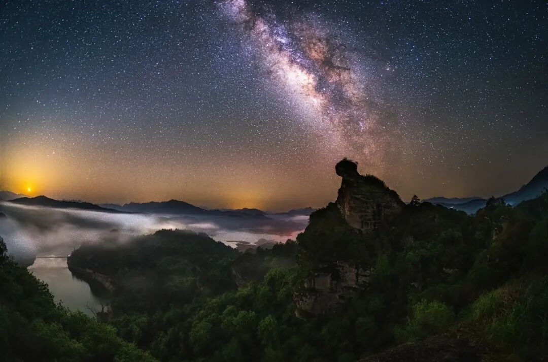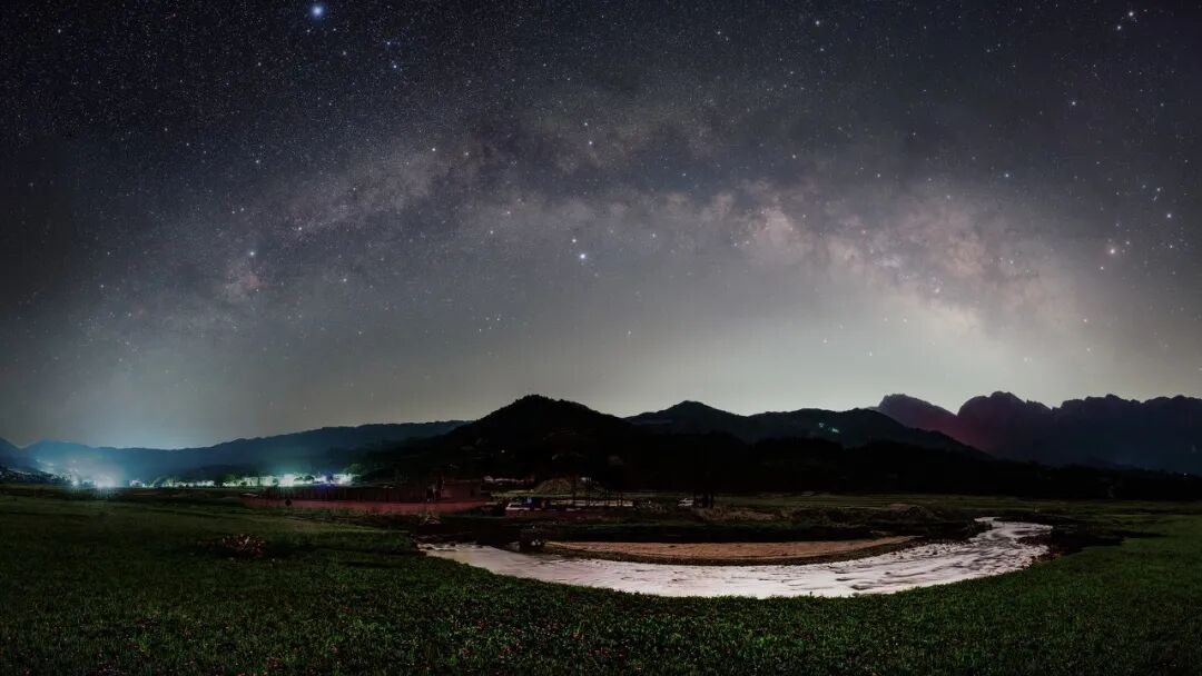 茗洋湖,前身名叫茗洋关水库,位于江西省上饶市,水库建成于1959年,四周风景秀丽,东面和南面是上饶市著名的灵山风景区,灵山山高林密,峡谷纵横交错。近期茗洋湖在进行维修维护,湖水已经拦截,得以露出大部分湖底,整个湖区只留有一条涓涓细流,湖底小花盛开,白天牛羊成群,晚上就静悄悄,如此才有机会在湖底拍摄到这张茗洋湖底的小河与远处灵山上升起的银河,等水库蓄水,就不知道何年何月才能重现此景。