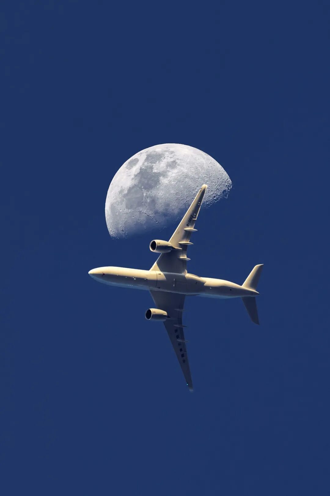 飞机凌月并非巧合,需结合实时航线和月轨,为拍摄这一画面,我来到上海市嘉定区。下午18:42分,太阳还未落下,飞机从距离我头顶大约3km飞过,穿过月亮。按动快门,将这一瞬间定格下来。