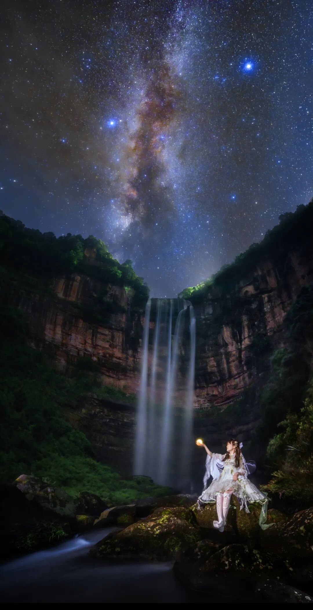 少女执灯照清涧,坐望银河落九天。6月中旬的夜晚,凌晨3点夏季银河竖立在瀑布正上方,少女坐在溪流旁的石头上执灯仰望星空,看星河坠落,听飞瀑轰鸣。