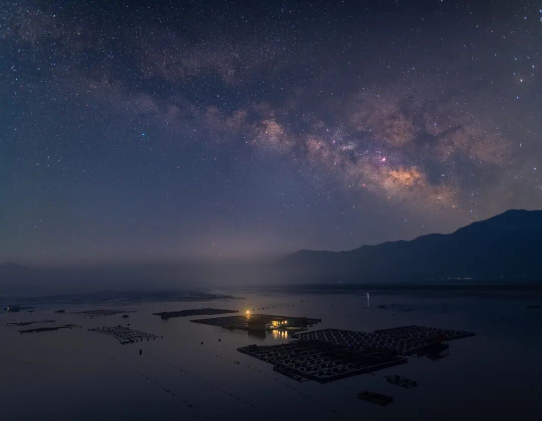 西面是海上渔排日落场景,也是霞浦摄影团必拍之处,而反方向却少有人问津。通过计划确定东南面方位可以拍到银河后,看准天气,和小伙伴前往拍摄,正好碰到淡季,海上渔家基本都撤离了,只留下一家坚守。半夜浩瀚星空下,一盏明灯给来往的渔船指明了前进的方向。