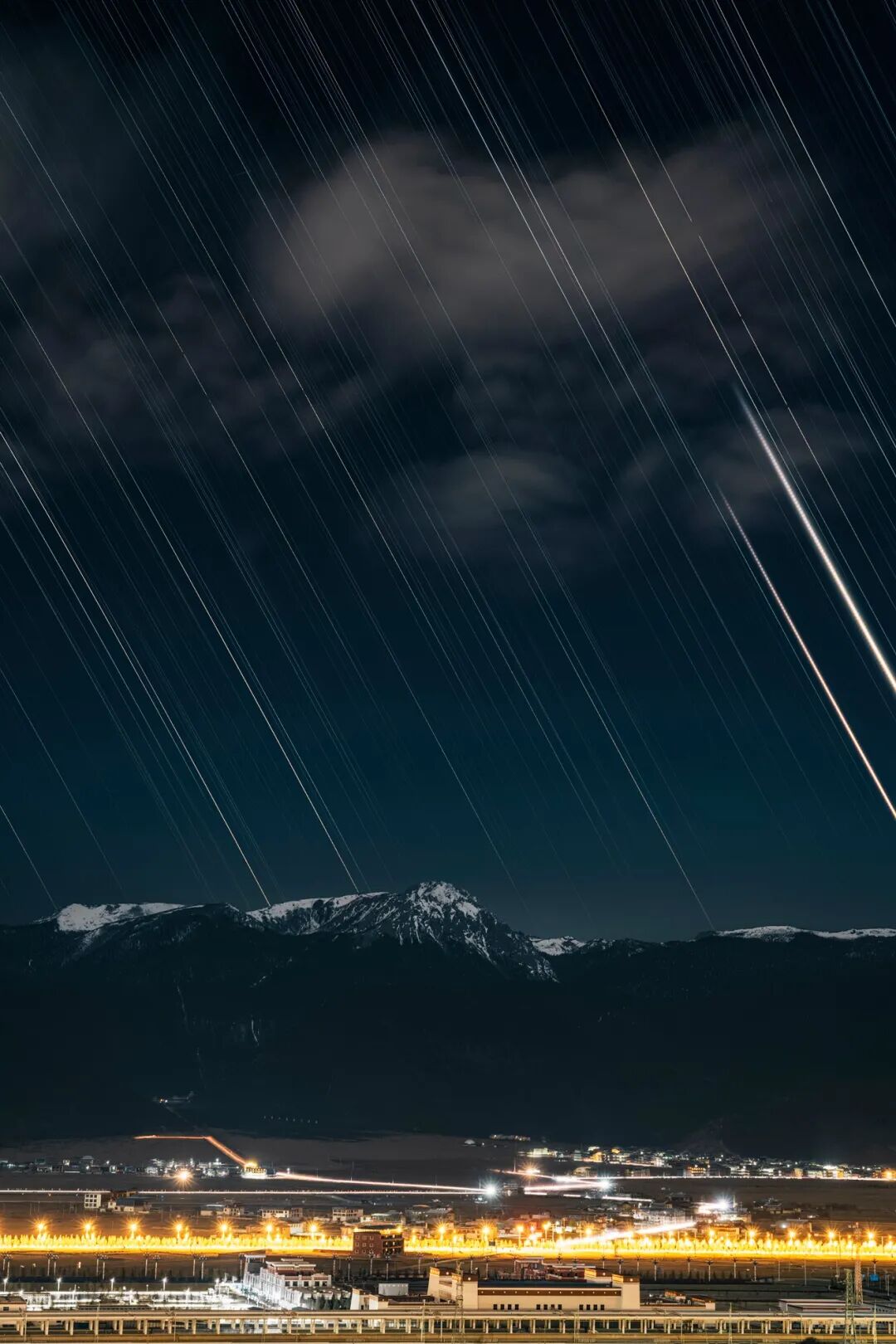 月光下的雪山格外透亮,雪山上空的斗转星移,记录着时光流淌,右侧两条粗壮的星迹分别属于金星和木星,雪山下有藏族小村、灯火通明的国道214和正在建设中的香格里拉火车站。