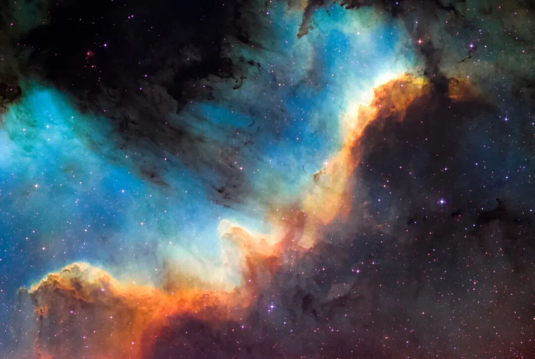 北美洲星云(NGC 7000)位于天鹅座,靠近天津四(天鹅的尾部,也是天鹅座内最亮的一颗星)的一个发射星云。这个发射星云形似北美洲大陆,特别是东南的海岸,因而得名。天上的北美星云能够做地球上的北美洲人不能做的事情——制造恒星。特别的是,和困在地球上的大陆相似,状如中美洲和墨西哥的明亮部分实际上是一张气体、尘埃和新形成的恒星的温床,被称为天鹅座围墙。上面的以代表色显示的图像显示这一恒星形成的围墙正在被明亮的年轻恒星照亮和侵蚀,并且部分地被那些恒星制造的暗尘埃所掩盖。