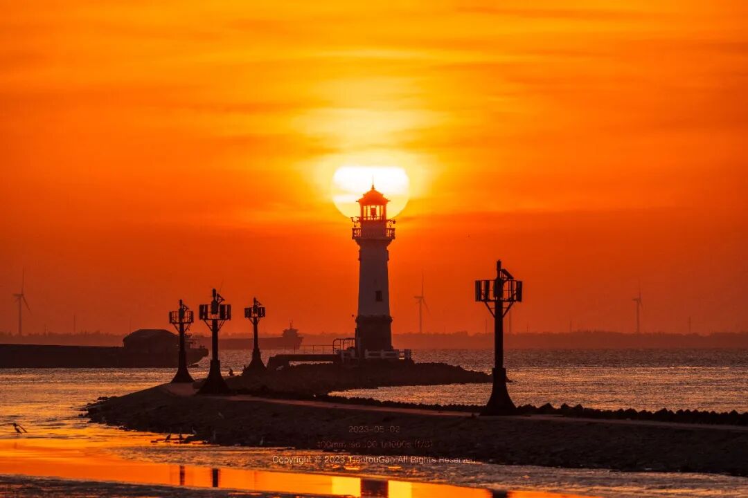 这张照片在 2023 年 5 月 2 日凌晨 5 点拍摄于上海市宝山区吴淞口灯塔。一年中如此构图只有几次的机会,需要天时地利人和。