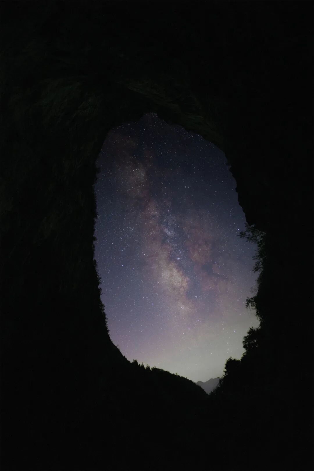 2019年的孟秋,我曾前往位于江油市含增镇的乾元山拍银河,但当时因为各种机缘不成熟没有成功,但是在银光洞洞口的一个随手拍摄让我有了创作这幅作品的遐想。借助摄影规划软件,多次模拟了构图与参考时间,本计划于次年的夏季再来,结果因为疫情一搁就是三载。今年7月我再次来到这里,天时地利人和,终于完成了这幅作品。从银光洞洞口仰望星空,目视银河自东向西渐渐垂挂洞口,此刻天地相合,婉若一只慧目,洞鉴凡尘。