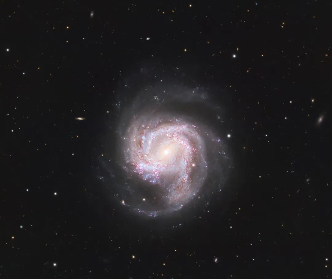 M61也被称为NGC 4303,位于室女座星系团内,距离我们仅5500万光年远。它被认为是类似于我们银河系的棒旋星系的一个例子。与其他旋涡星系一样,M61也具有巨大的旋臂、宇宙尘埃带、粉色的恒星形成区和年轻的蓝色星团。