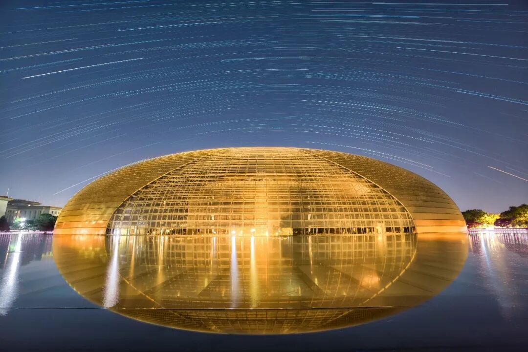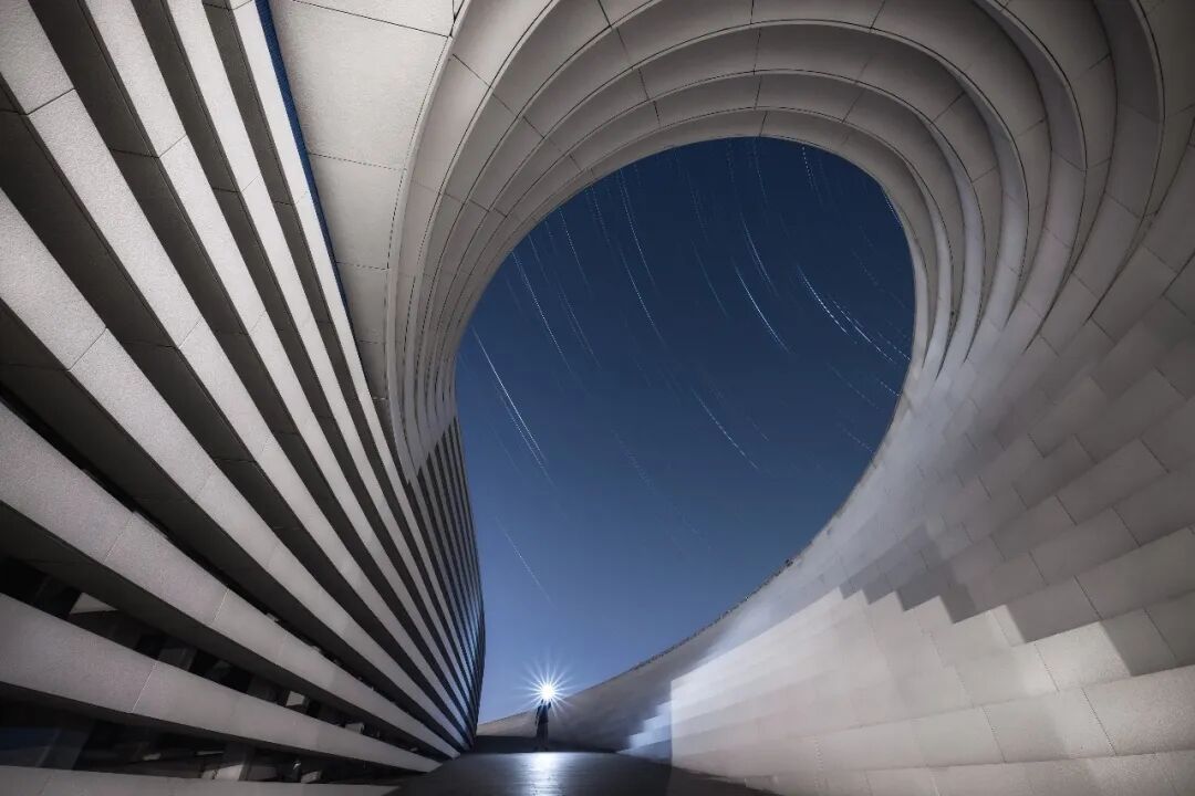 丝绸之路国际文化交流中心建筑内部以“丝绸之路”文化理念进行设计,通过直线与弧线的线条组合,形成了流动感极强的震撼视觉效果。入夜后,我站在建筑内部抬头仰望星空,此时繁星漫天,一颗颗星点随着时光的流逝在建筑上空留下了线条的轨迹,与地面的建筑线条共同形成了一副奇妙的跨时空画面。