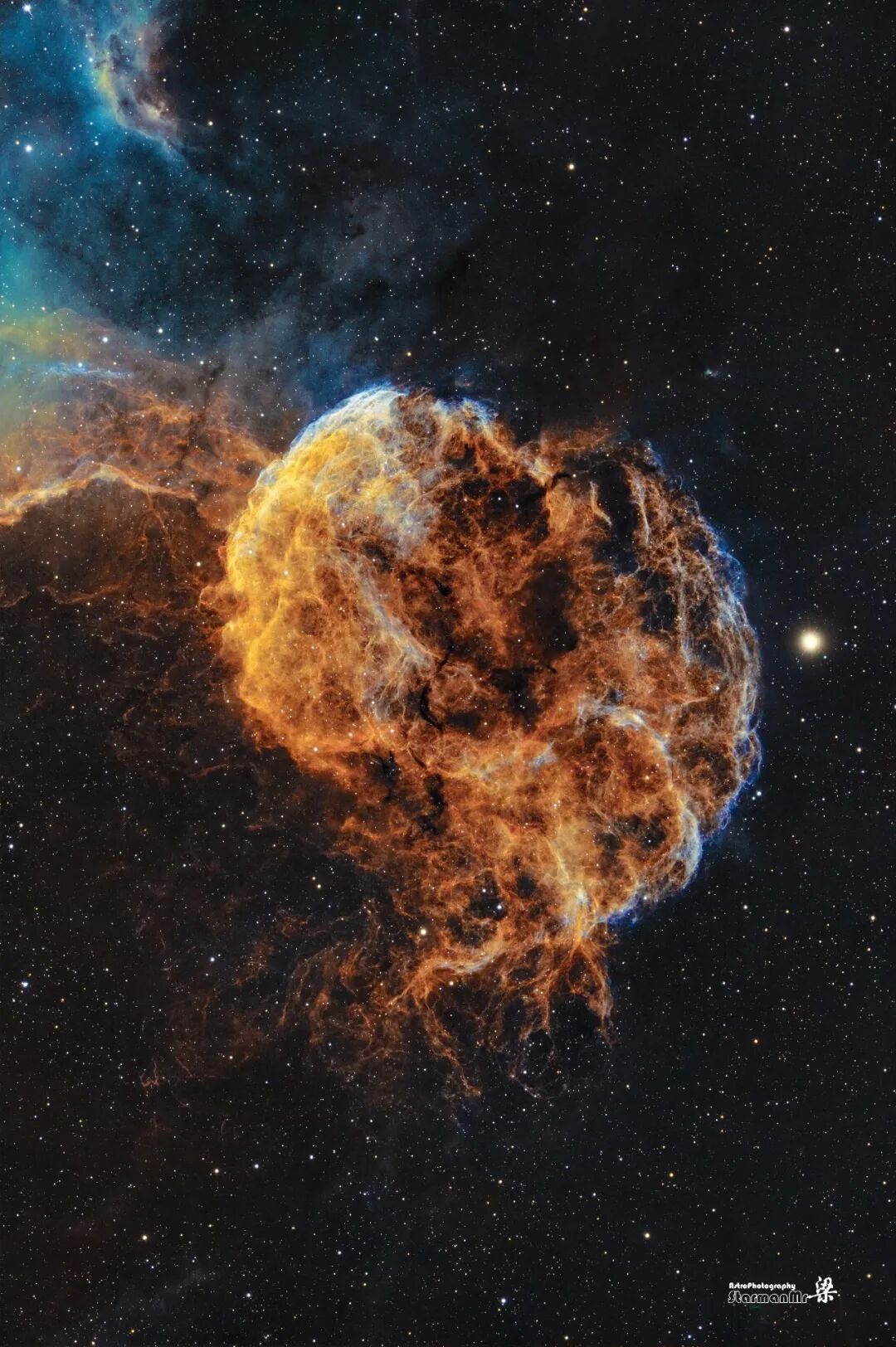 IC 443,也被称为水母星云(Sh2-248),是位于双子座中的一个星系超新星遗迹(SNR),距离地球约5000光年,形成于3000-30000年前发生的一次超新星爆发,是研究最多的超新星遗迹与周围分子云相互作用的案例之一。其外形酷似一个水母遨游在星海之中。