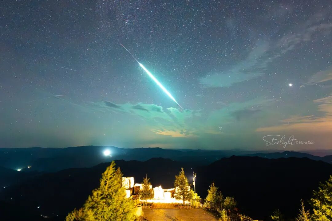 当我们正在山上看着望远镜里的星云星系,相机在寂静的山顶传出快门声,这时一颗火流星划破天空,众人抬头惊叹,流星发出亮绿的光芒照亮了整个天空,也照亮了周围的云层。