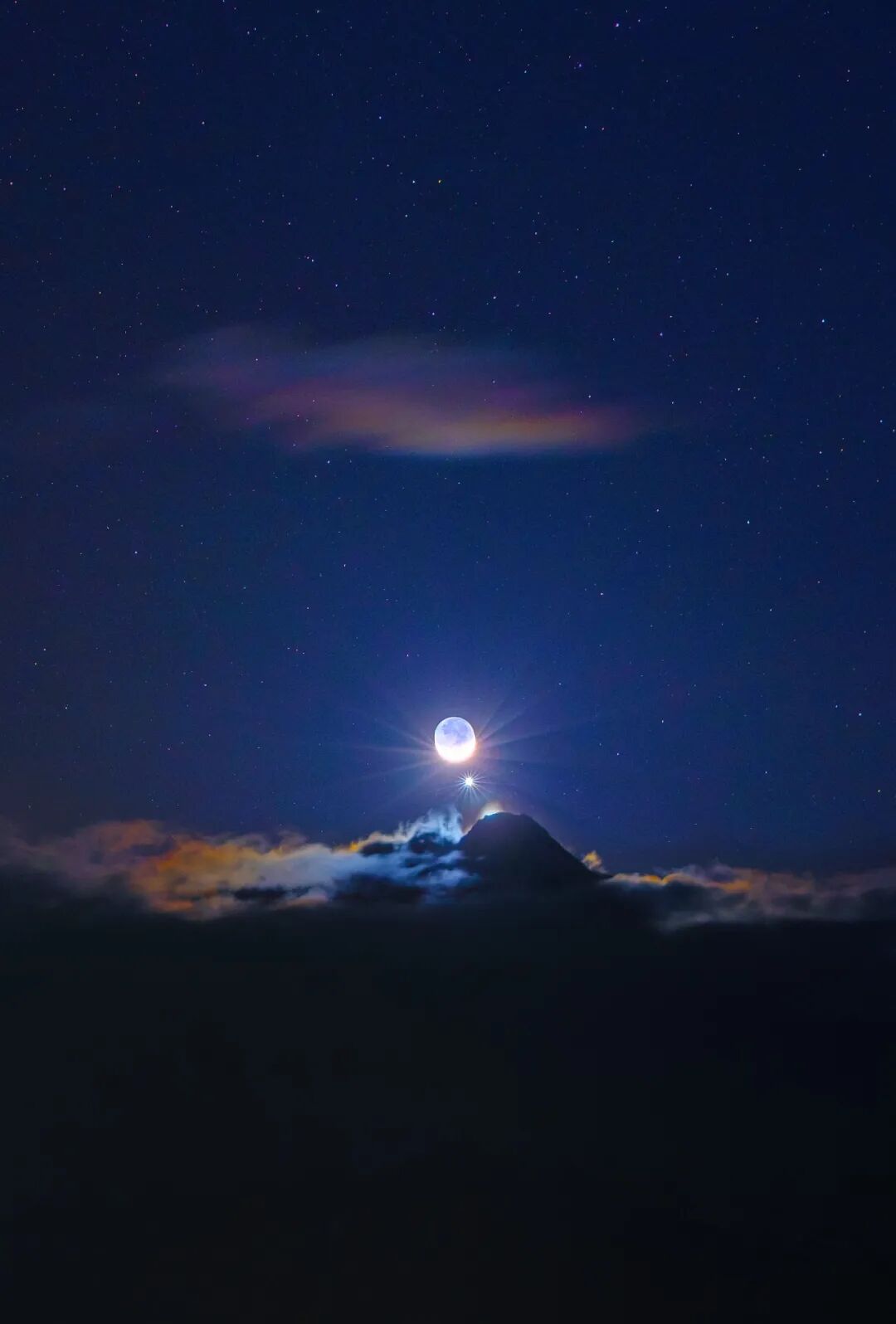 月亮和金星,地球夜空中最明亮的两个天体。这一天它们双双落在梅里雪山最右侧,山峰上的云被月光照亮,形成彩色的月华。