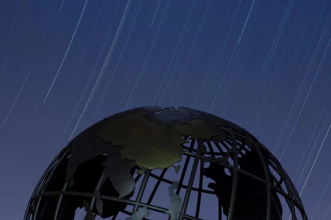 这张图片用叠加的方式展示了月光下的星轨,前景是我的学校里一处地球形状的建筑。在上海光污染严重的情况下,背景却展现出今人舒适的紫色。为了拍摄这一张照片我从夜晚熬到凌晨。拍摄了很多次,最终获得了满意的画面。希望你也可以从画面里感受到在无垠的宇宙中,地球显得无比渺小与宁静。