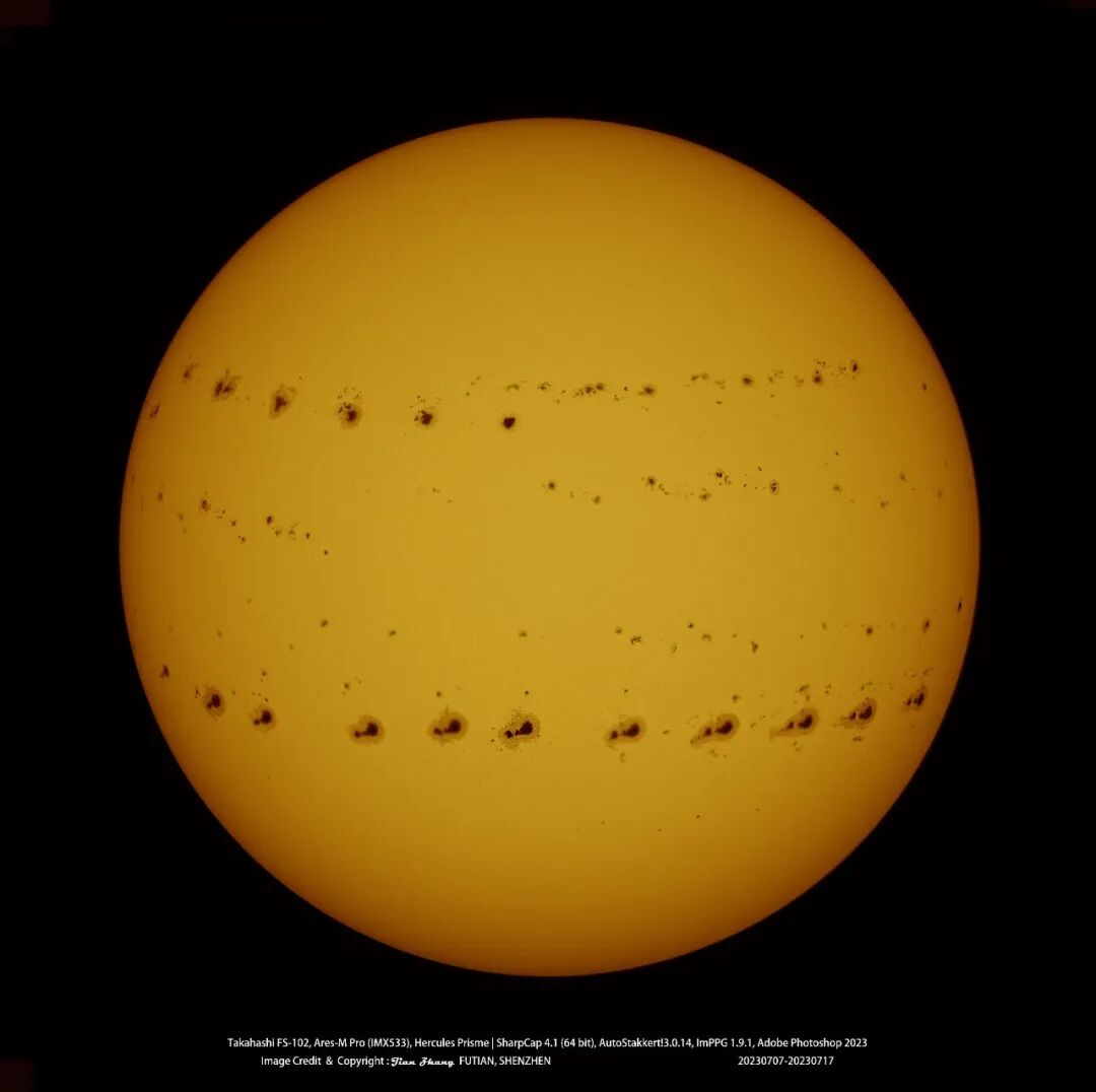 连续十一天的全日面图片,用PS叠加,形成一张完整的从左到右的黑子日面变化图。