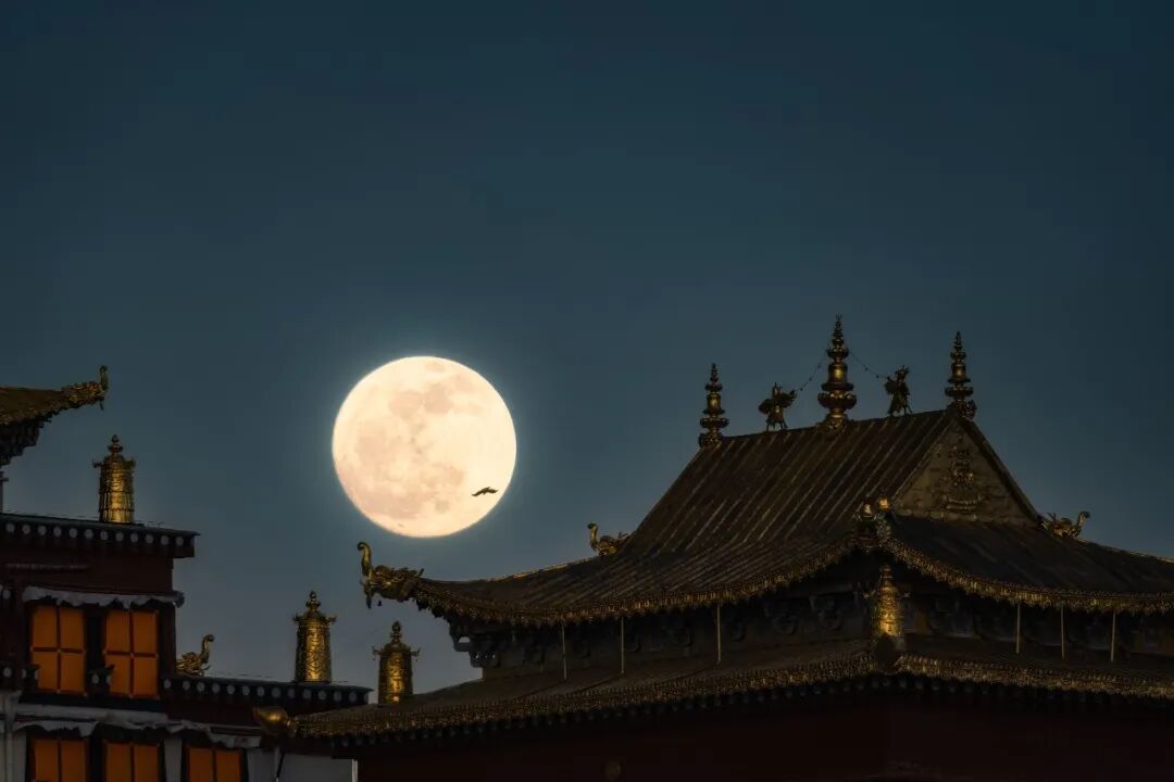 噶丹·松赞林寺是云南省规模最大的藏传佛教寺院,也是川滇一带的黄教中心,被誉为“小布达拉宫”。寺庙依山而建,外形犹如一座古堡,集藏族造型艺术之大成,有“藏族艺术博物馆”之称,五世达赖喇嘛赐名“噶丹·松赞林”。通过巧摄计算好满月升起的时间和角度,使用长焦镜头完成了松赞林寺大殿金顶悬月,盘旋于大殿上方的一只红嘴山鸦正好飞过月亮,为画面增色。