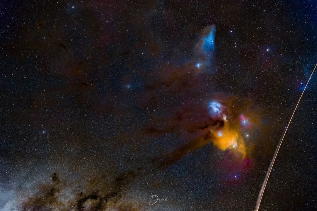 和同伴们第一次来到黑区,见到了最纯净的星空,即使强度稍大的低空气辉也并未影响星云的清丽。临拍摄结束恰有一火箭划破夜空掠过星空调色盘,在图片中留下明亮的轨迹与云迹,在暗夜中绽放出绚丽光芒。