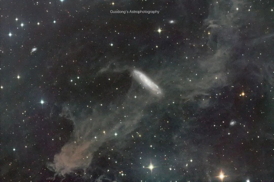 画面中心明亮的旋涡星系(NGC7497)看起来像是被一个可怕的太空幽灵藤蔓抓住了,这就是这张照片的有趣之处。实际上,该星系距离我们5900万光年,而这里的星云(MBM54)距离我们不到1000光年,是银河系内离我们最近的低温气体和尘埃云——星系卷云之一。