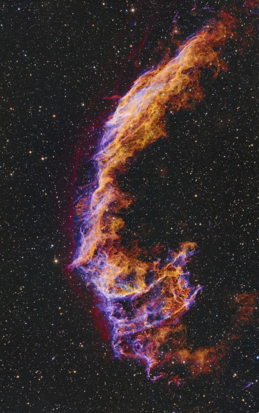 东面纱星云是面纱星云的一部分,主体编号NGC6992,属于天鹅座超新星爆发的遗骸,距离我们1400光 年。东面纱星云也称为C 33,具有张牙舞爪的外观和夸张的色泽,天生就是万圣节面具。它的宽度大约是10个光年。