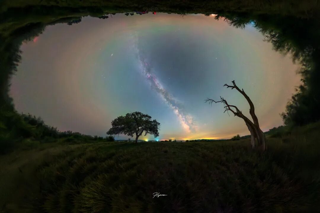 在宇宙的辽阔背景中,一副令人深思的画面呈现眼前。两棵树分别矗立在银河两侧,形成鲜明的对比。一棵树生机盎然,树叶绿如翠玉,象征着生命的活力和希望,而另一棵树呈现出截然相反的景象:它干枯憔悴,枝条枯萎,没有一片叶子,代表着死亡和衰败。隔河相望的两棵树映衬出生命与死亡的对立,提醒着我们生命的可贵和脆弱。生命的活力和终极的死亡在宇宙的长河中交织,构成了壮丽而悲壮的画卷。