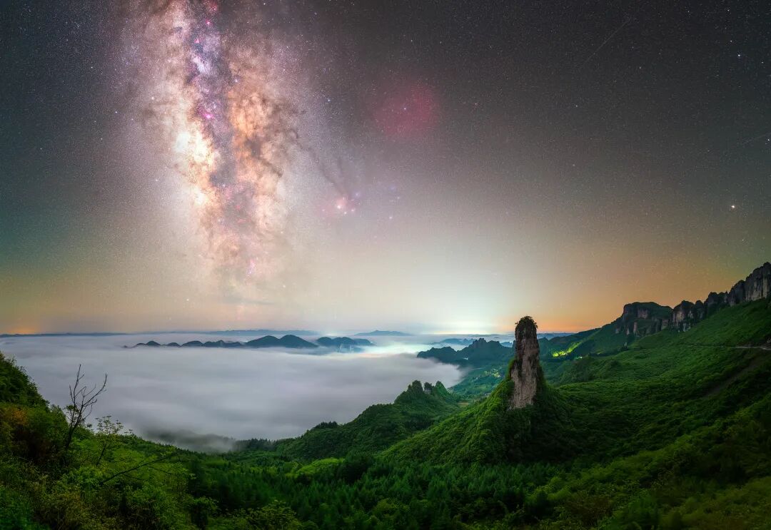 连续的暴雨过后难得晴了一天,云海在峡谷间慢慢汇集翻滚,遮蔽了村庄的灯光,而眼前这根从谷底拔地而起的石柱,孤独地矗立在云海之上,和银河隔空相望,傲视苍穹。