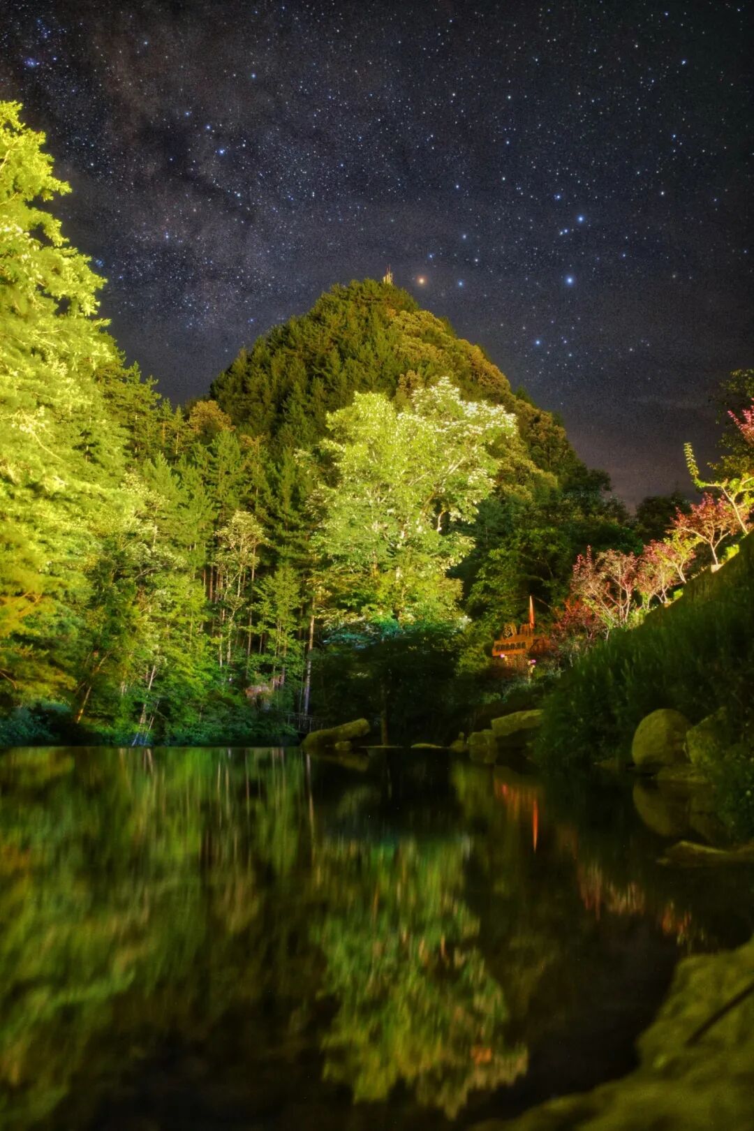 入夜后,天气由阴转晴,听着屋外的蝉鸣鸟叫,望见山中密林被酒店灯光照亮,想起山下涓涓细流应会倒影出这片山林,于是拿起相机前往河边,天边心宿二璀璨,按下快门后便记录下了如此美景。