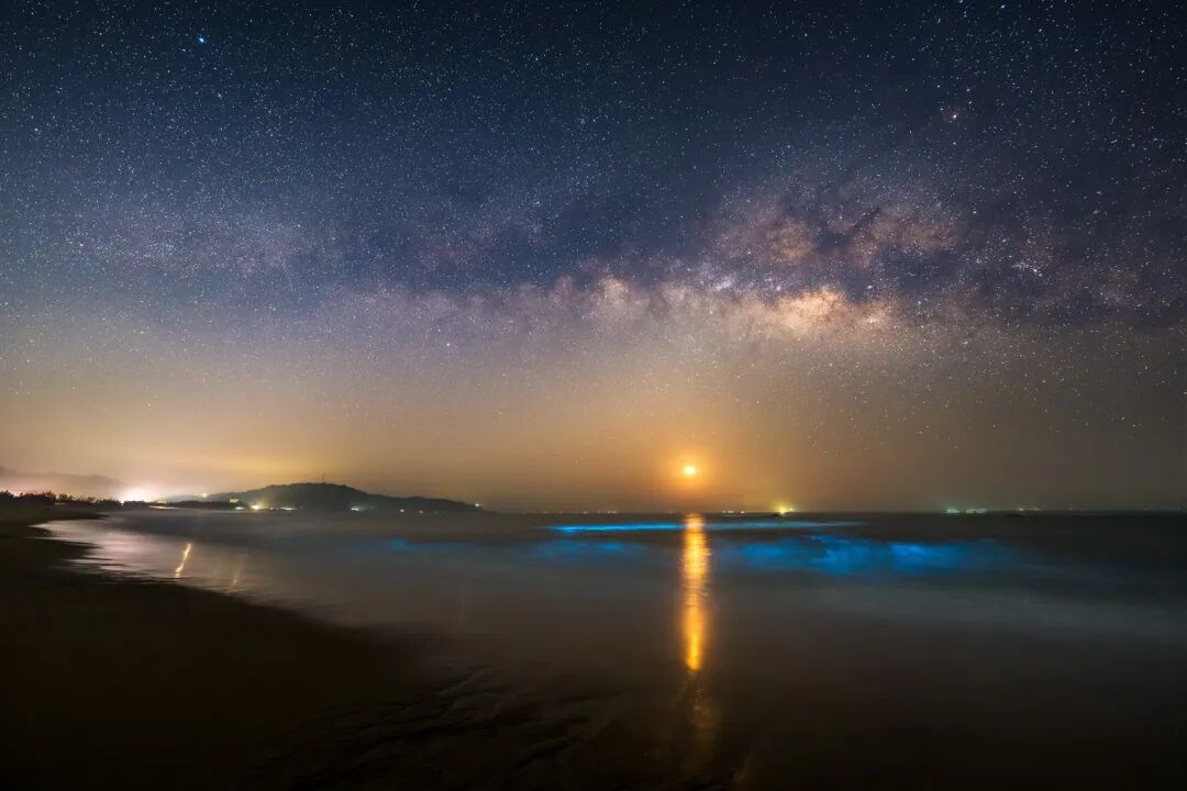这是在海陵岛拍的延时中的一张,只有在合适的月相——蛾眉月,合适的时间——凌晨5点,合适的季节、天气、温度,才能正好集齐蓝眼泪与银河伴月,实在难得。